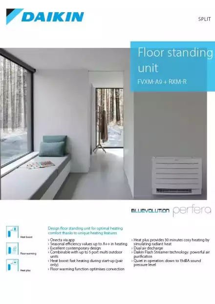 Perfera floor FVXM-A9: the most suitable cost-effective monosplit already and with the possibility of effective air conditioning for up to 5 rooms with only 1 outdoor unit. Designed for year-round comfort. With unique heating functions, you rest easy on cold days thanks to the Heat boost, Floor warming and Heat plus functions. The characteristic design of the Perfera floor air conditioner allows the air flow to heat simultaneously both downwards at the feet and upwards towards the ceiling, ensuring an even distribution of temperature to every corner in a room. Equipped with Daikin's signature Flash Streamer technology and titanium apatite deodorizing filter, ensuring your air is free of viruses, allergens and odors. WiFi adapter integrated in the indoor unit for the Daikin Onecta app, voice control via Google Assistant and Amazon Alexa.