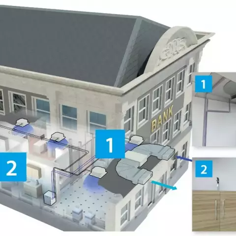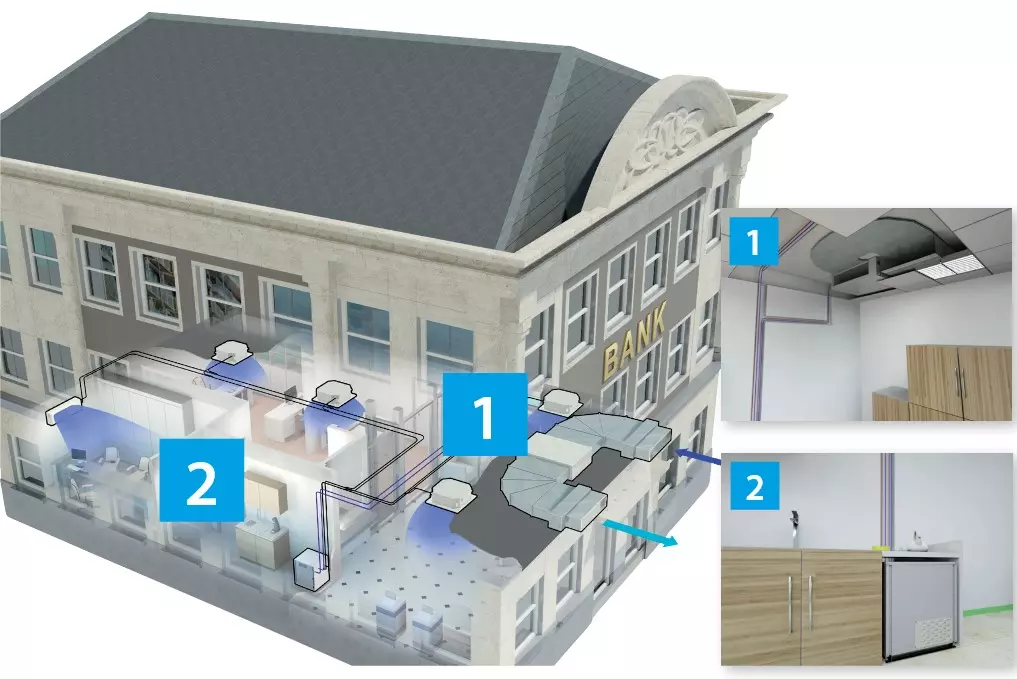 Компактна и проектирана за вътрешен монтаж , уникална VRV IV i-серия е толкова дискретна, че е практически невидима и идеална за градски центрове и зони с чувствителен шум . Без нужда от монтаж на покриви или в задните улички е по-лесно да получите строително разрешение, така че вашият бизнес да заработи по-бързо . Разделена на две части , нашата VRV IV i-серия е изключително гъвкава и лесна за монтаж. Поставете лекия топлообменник (1) в окачения таван и монтирайте компактния компресорен агрегат (2) в заден офис, складово помещение или кухня. Избягвайте монтаж на покрива и в задната алея, без да жертвате ценно търговско пространство.