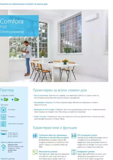 Daikin подобряват климатиците от серия COMFORA по отношение на енергийната ефективност, функциите за свързване и дизайна за релакс и удоволствие всеки ден при използването им. Проектирани за дом или за малък търговски обек, лесни за монтиране, компактният размер на COMFORA FTXP-N ги прави по-лесни за инсталиране във всякакво помещение, включително инсталации над врата. Произведени в Европа в Чехия, новите климатични уреди COMFORA отразява европейските интериорни предпочитания. Чист въздух със сребърен филтър за отстраняване на алергени и по-фино пречистване, дезодориращ филтър от титаниев апатит, унищожаване на алергени и миризми. Интелигентно управление чрез приложението Onecta, включително гласово управление чрез Google Assistant и Amazon Alexa, стандартно вградени в клас 20/25/35. Гарантирано затопляне/охлаждане без неприятна директна въздушна струя към обитателите. Иконномичният режим на работа за спестяване енергия и разходи, когато трябва да се използват други уреди, изискващи голяма консумация на енергия, оптимизира консумацията, без да намалява ефективността, с клас до A++ при отопление. С почти шепотно ниво на звука от новото вътрешно тяло COMFORA FTXP-N имате по-качествен отдих. Mного хубаво е на хубаво с новата серия на Daikin !