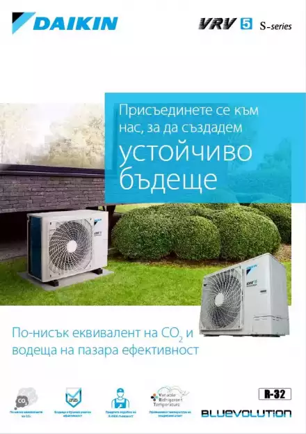 - Това следващо поколение VRV 5 S-серия BLUEVOLUTION осигурява най-добра стабилност през целия жизнен цикъл благодарение на водещата реалистична сезонна ефективност на пазара, използвайки хладилен агент R-32.