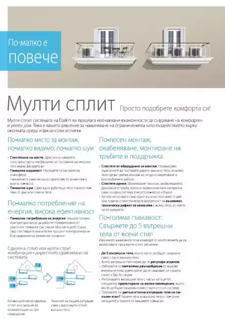 Мулти сплит системите на DAIKIN Ви предлагат решение как да подобрите комфорта си у дома и на работното място, с по-малко шум , с по-малко видими и с по-малко място за монтаж Външните тела. С МУЛТИ сплит се заема По-малко място за външното тяло, и имате Повече гъвкавост за вътрешните тела : може да вържете до 5 броя , различни по тип - стенни,таванни,подови - към 1 външно тяло . Дори до 12 вътрешни към едно , т.н. Super-Multi външно тяло термопомпа VRV серия S. Продуктите работят с хладилен агент R-32 , който намалява въздействието върху околната среда с 68%, в сравнение с R-410A и води директно до по-ниско потребление на енергия.