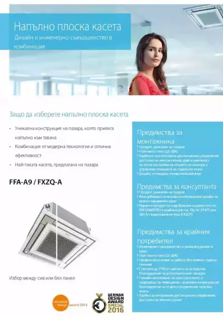 Новаторски дух в дизайн и технология! Инверторен компресор, целогодишна енергийна ефективност до А++ , работен диапазон до -20оС външна температура. Цветове на панела в свежо бяло или стилно сребристо, възможност за отделно управление на всяка клапа и за приток на пресен въздух . Интелигентен сензор, който комфортно разпределя въздушната струя встрани от всяко лице и подов сензор, който отчита средната температура на пода и гарантира равномерно разпределение на температурата между тавана и пода. Намален разход на електроенергия благодарение на технологията Bluevolution c хладилен агент R-32 и технология VRT за променлива температура на хладилния агент, която интуитивно регулира температурите на R-32 въз основа на климатичните условия и потребностите на сградата. Толкова тихо работи, че я забелязвате само с привлекателния й съвременен дизайн, за който е световно отличена с reddot.
