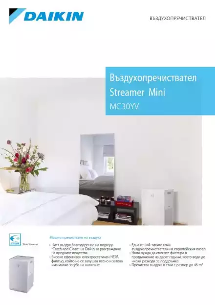 Новият МC30YV Streamer Mini е с вграден дезодориращ филтър за абсорбиране и премахване на миризми и работи с патентована технология Flash Streamer - за разлагане на вредни вещества, полени, бактерии. Перфектно свежо решение за здравословен въздух в малки апартаменти, спални, детски стаи, малки работни пространства, хотелски стаи. Eдин от най-тихите уреди на европейския пазар за приятен почистен вътрешен въздух благодарение на технологичния подход "Catch and Clean" ("Улови и Пречисти") за молекулно разграждане на вредители. Въздушен филтър от мрежа полиетилен терефталат, дездориращ филтър, 3 степени на вентулатора, режим за сън.
